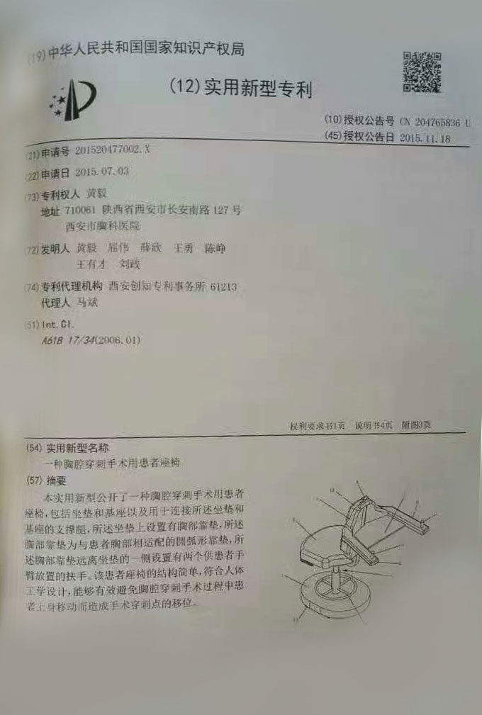 【醫(yī)者創(chuàng)新,成果共享】。西安市胸科醫(yī)院超聲科黃毅主任發(fā)明的“胸腔穿刺手術(shù)椅”專利,由泰樂康獨家使用。預(yù)計下半年推出產(chǎn)品,為胸腔穿刺手術(shù)提供便利。